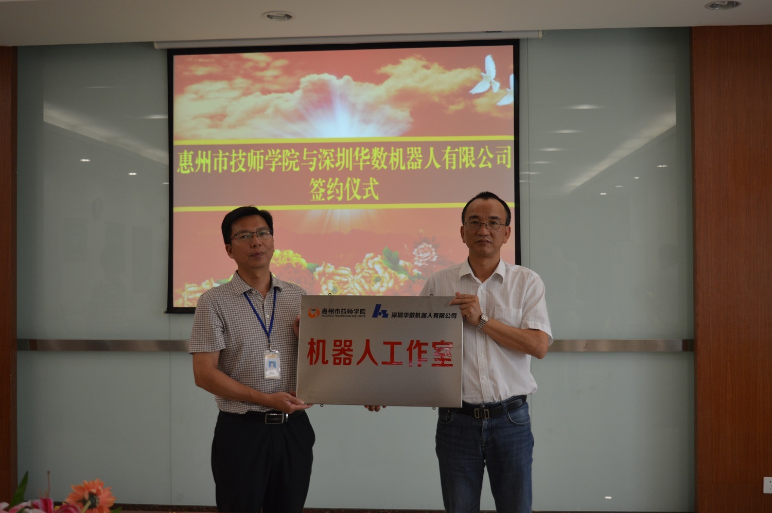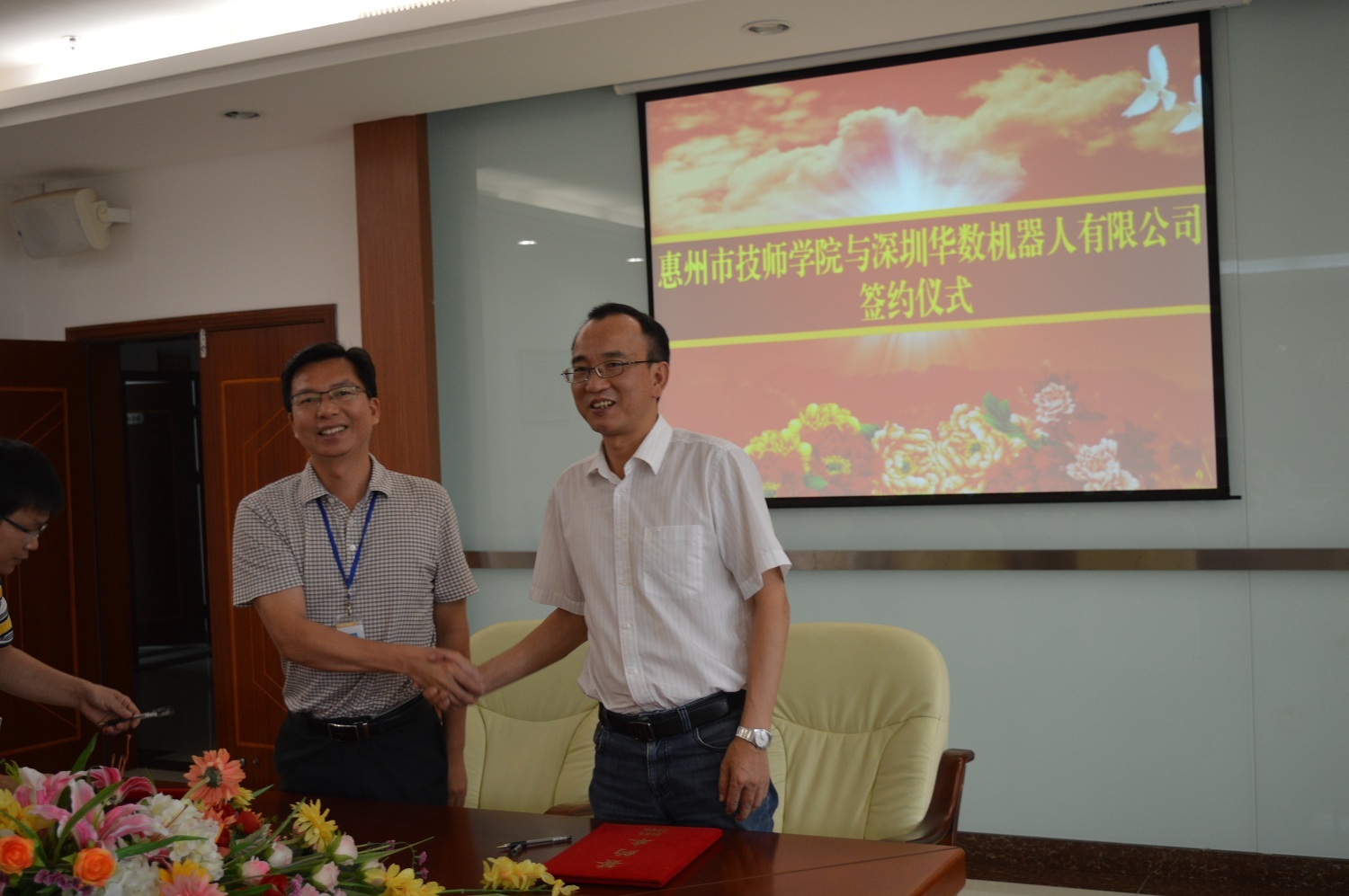 2016年6月7日,惠州市技師學院與深圳華數機器人簽約儀式隆重舉行。惠州市技師學院譚院長、分管校企合作黃院長、校企合作處朱處長、制造工程系邱主任、金主任出席簽約儀式,武漢華中數控股份有限公司副總裁、深圳華數機器人有限公司總經理熊清平,副總經理楊志等出席本次簽約儀式。 ? ??