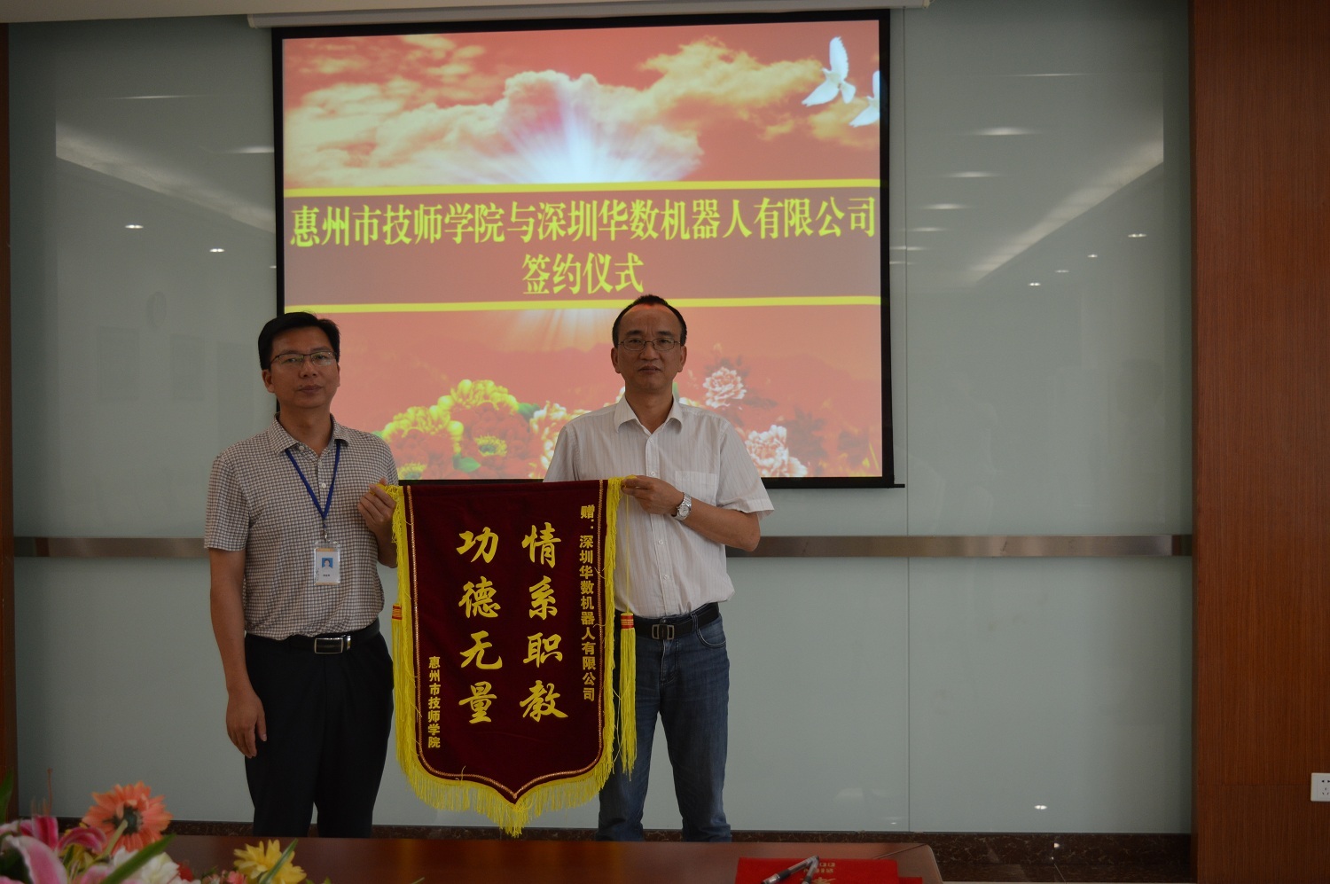 隨后,雙方進行簽約儀式,惠州市技師學院聘請熊清平總經理為特聘專家,同時贈送華中數控“情系職教,功德無量”的錦旗。雙方將共同在“機器人工作室”、“校企合作基地”、“人才培養中心”、“產學研基地”等方面將開展一系列合作。