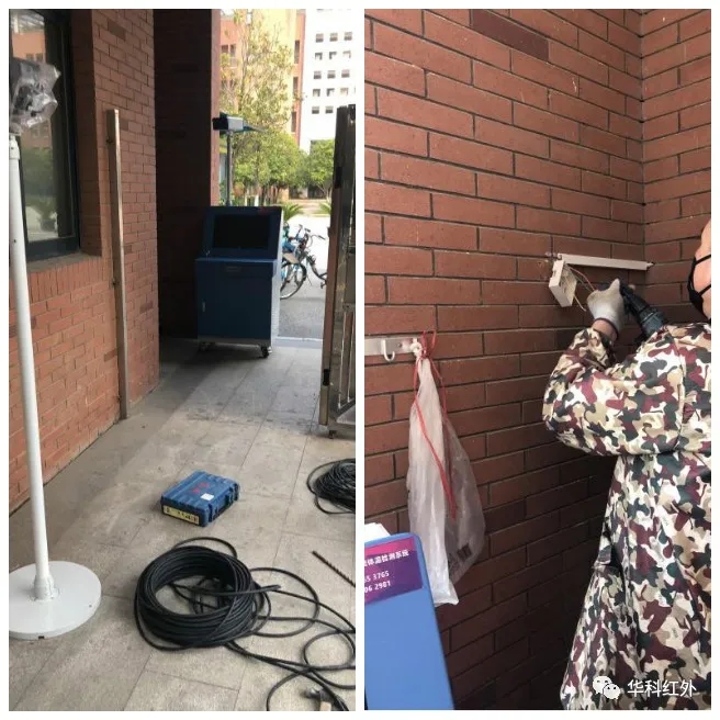 本次設備安裝均由華中數控兩位工程師熊焰、方天完成,分別安裝在學校西大門兩側,經過工程師的精心調試,設備正式上崗,這些設備可在1秒內檢測出經過人員的人體溫度 ,自動追蹤體溫異常者并報警,屆時學校值班教師在電腦前即可立即對體溫異常的師生進行個別二次檢測排查,立即啟動預案采取就地管控措施。